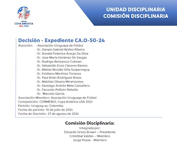 “Advertir expresamente a la Asociación Uruguaya de Fútbol, a los jugadores y al oficial que en caso de reiterarse cualquier infracción a la disciplina deportiva de igual o similar naturaleza a la que ha traído causa el presente procedimiento será de aplicación lo dispuesto en el Artículo 27 del Código Disciplinario de la Conmebol, y las consecuencias que del mismo se pudieran derivar”, aclara el comunicado que difundió Conmebol.