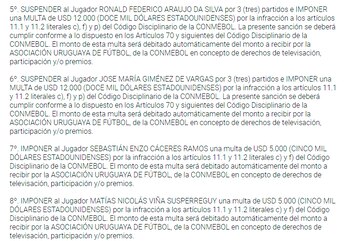 El delantero Darwin Núñez fue el que recibió el castigo más severo con cinco fechas, seguido por el mediocampista Rodrigo Bentancur, quien estará cuatro jornadas sin tener actividad oficial. Mathías Olivera, Roland Araújo, José María Giménez, Sebastián Cáceres, Matías Viña, Emiliano Martínez Toranza, Brian Rodríguez, Facundo Pellistri y Santiago Mele fueron suspendidos por tres fechas.
