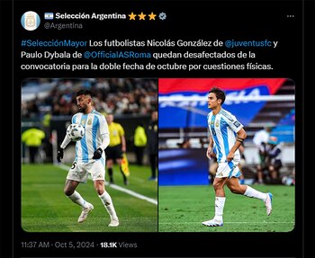 La Selección Argentina sufrió dos bajas de último momento en su lista de convocados para la doble jornada de Eliminatorias Sudamericanas rumbo al Mundial 2026. A través de su cuenta oficial de X (antes Twitter), la Albiceleste confirmó que los delanteros Nicolás González, de la Juventus, y Paulo Dybala, de la Roma, no formarán parte de la delegación por problemas físicos.