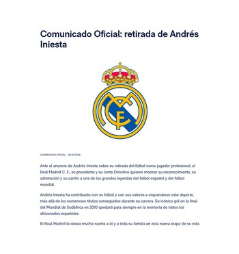 Ante el anuncio de Andrés Iniesta sobre su retirada del fútbol como jugador profesional, el Real Madrid C. F., su presidente y su Junta Directiva quieren mostrar su reconocimiento, su admiración y su cariño a una de las grandes leyendas del fútbol español y del fútbol mundial.