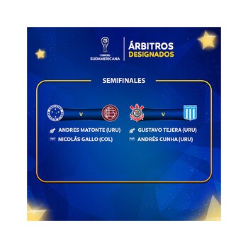 En lo que respecta a los duelos de la Copa Sudamericana, el primero se dará en Belo Horizonte. En el Mineirao, Cruzeiro recibirá a Lanús el miércoles 19. El encargado de impartir justicia en esta ocasión será el uruguayo Andrés Matonte, quien estará acompañado por sus jueces de línea Martín Soppi y Carlos Barreiro. El cuarto árbitro será Mathías De Armas. En el VAR estará Nicolás Gallo, quien tendrá a su lado a Heider Castro y Richard Trinidad. El asesor de árbitros será el paraguayo Joel Ruiz y el quality manager el chileno Claudio Ríos.