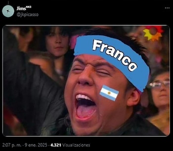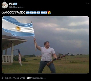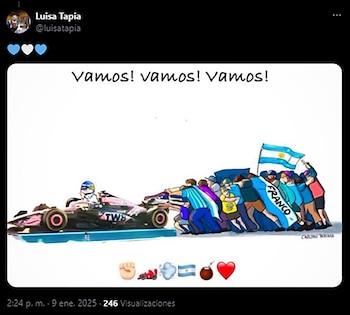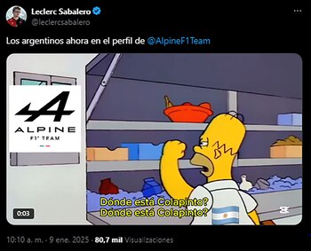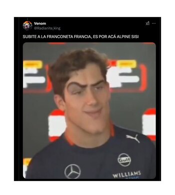 La mayoría de los memes tuvieron una clara mención a la Argentina, el país de Franco Colapinto y los internautas aprovecharon para compartir banderas celestes y blancas con frases como “orgullo nacional”, “vuelve la Aplineta”, “lo que Alpine no sabe es que con Franco llegó la mejor hinchada del mundo” y un mensaje con tinte futbolero para los franceses: “Subite a la Franconeta, Francia. Alpine, es por acá”.