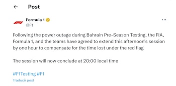 La prueba de pretemporada se extenderá una hora más a raíz del corte de luz que interrumpió la actividad: “Tras el apagón sufrido durante los entrenamientos de pretemporada en Bahréin, la FIA, la Fórmula 1 y los equipos han acordado prolongar una hora la sesión de esta tarde para compensar el tiempo perdido por la bandera roja. La sesión concluirá a las 20:00 hora local”.
