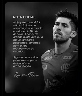 “Al aterrizar en Río de Janeiro, alrededor de las 5:30 de la mañana, regresando a casa después de un partido en Argentina, algunos coches pertenecientes a jugadores del Flamengo fueron objeto de un intento de robo en la Linha Amarela, cerca de Bonsucesso. El vehículo donde se encontraba el portero Rossi, que está blindado, recibió cuatro disparos. A pesar del susto, nadie resultó herido y el robo no se llevó a cabo”, señaló el club, cuyo comunicado fue replicado por medios como UOL, Globo y Lance.