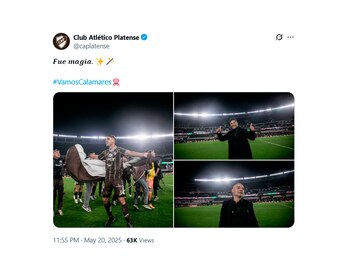 La tercera publicación fue más sutil, pero no menos filosa. Platense compartió tres fotografías: una del festejo colectivo en el césped del Monumental y dos de los entrenadores Favio Orsi y Sergio Gómez celebrando en el campo de juego. La leyenda que acompañaba las imágenes era simple: “Fue Magia”.