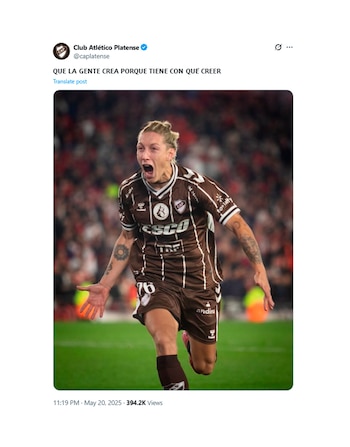 El primer mensaje apareció poco después del cierre del partido. En la red social X, el perfil de Platense publicó una foto de Schor celebrando su gol con una frase que resonó inmediatamente en el ambiente riverplatense: “𝗤𝗨𝗘 𝗟𝗔 𝗚𝗘𝗡𝗧𝗘 𝗖𝗥𝗘𝗔 𝗣𝗢𝗥𝗤𝗨𝗘 𝗧𝗜𝗘𝗡𝗘 𝗖𝗢𝗡 𝗤𝗨𝗘́ 𝗖𝗥𝗘𝗘𝗥”.