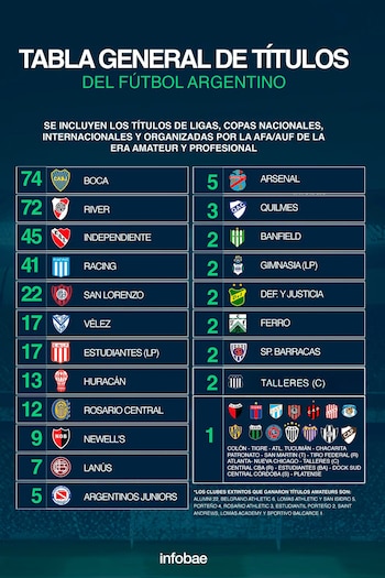 Si se toman en cuenta todos los títulos de la historia, sumando Ligas, Copas Nacionales e internacionales, contando el amateurismo y profesionalismo, Boca Juniors lidera el listado con 74, seguido por River Plate (72) e Independiente (45). Detrás aparece Racing con 41 y San Lorenzo con 22.
