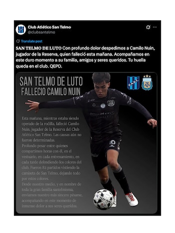 “Esta mañana, mientras estaba siendo operado de la rodilla, falleció Camilo Nuin, jugador de la Reserva del Club Atlético San Telmo. Las causas aún no fueron determinadas. Profundo pesar entre quienes compartimos horas con él, en el vestuario, en cada entrenamiento, en cada tarde defendiendo los colores. Fueron 82 partidos vistiendo la camiseta de San Telmo, dejando todo por estos colores. Desde nuestro medio, y en nombre de toda la gran familia santelmista enviamos nuestro más sincero pésame, acompañando en este momento de inmenso dolor a sus seres queridos”, detalló el perfil @ClubSanTelmo en redes sociales.