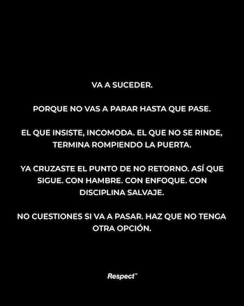 A través de sus redes sociales, en viaje rumbo a Charlotte, publicó un mensaje en las redes sociales: “Va a suceder. Porque no vas a parar hasta que pase. El que insiste, incomoda. El que no se rinde, termina rompiendo la puerta. Ya cruzaste el punto de no retorno, así que sigue. Con hambre. Con enfoque. Con disciplina salvaje. No cuestiones si va a pasar, haz que no tenga otra opción”.