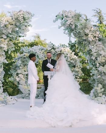 Endrick y Gabriely Miranda celebraron una segunda ceremonia, esta vez acompañados por sus seres queridos, reafirmando su compromiso en una finca al aire libre. En esta ocasión, ambos vistieron de blanco, mientras que los invitados lucieron atuendos negros, creando un marcado contraste con las flores blancas que decoraban el jardín elegido para la celebración.