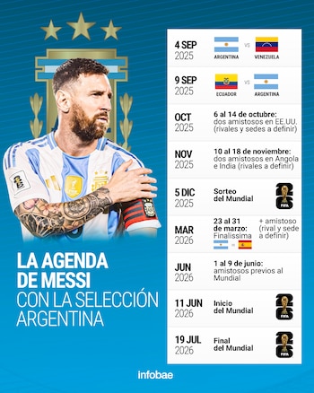 La siguiente ocasión en la que Messi podría vestir oficialmente la camiseta argentina será en la Finalissima frente a España, un torneo que enfrenta a los campeones de la Copa América y la Eurocopa. Este encuentro está programado para la ventana FIFA de marzo de 2026 (del 23 al 31 de marzo), aunque la fecha y la sede aún deben definirse, decisión que se tomará entre septiembre y noviembre de este año durante las Eliminatorias Europeas. Entre las ciudades candidatas para albergar el evento figuran Londres, Qatar y Arabia Saudita. En la edición anterior, celebrada en 2022, Argentina venció a Italia por 3-0 en Wembley (Inglaterra). Durante esa ventana de marzo, la selección podría disputar un amistoso adicional.
