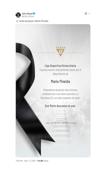 El presidente de La Liga Ecuabet, Miguel Ángel Loor, también utilizó su cuenta de X para sumarse a las manifestaciones: “Descansa en paz, querido Mario. Mi profundo sentido pésame a todos sus familiares y amigos. También a sus compañeros, dirigentes y funcionarios de su club Barcelona.” Las redes sociales de la Liga Ecuabet y de clubes como Emelec y Liga de Quito replicaron este tipo de comunicados.