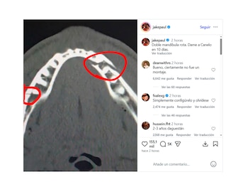 La fotografía publicada por Jake Paul en su cuenta de Instagram muestra con claridad las dos fracturas en su mandíbula, consecuencia directa del brutal derechazo con el que Joshua definió la pelea. “Doble mandíbula rota. Dame a Canelo en 10 días”, escribió el influencer junto a la imagen, provocando inmediatamente una oleada de reacciones entre aficionados y expertos del boxeo.