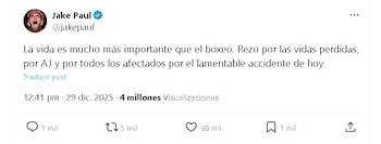 “La vida es mucho más importante que el boxeo. Estoy rezando por las vidas pérdidas, por AJ y todos los afectados de este desafortunado accidente de hoy”, publicó Paul en su cuenta oficial de X (antes Twitter). El estadounidense, quien había enfrentado a Joshua en el ring apenas diez días antes del accidente, se refirió de manera directa a la gravedad del suceso y optó por solidarizarse con su reciente adversario.