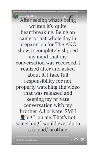 Cabe destacar que Kamaru Usman emitió un comunicado en sus redes sociales en las últimas horas pidiendo disculpas por la filtración. En la versión publicada en YouTube, algunas partes del intercambio parecen haber sido editadas. El diálogo entre ambos se viralizó ampliamente en redes sociales. “Después de ver lo que se está escribiendo, es bastante desgarrador. Estando frente a la cámara todo el día preparándome para el programa de The AKO, se me olvidó por completo que mi conversación fue grabada. Me di cuenta después y pregunté. Asumo toda la responsabilidad por no haber visto bien el video publicado y por no haber mantenido en secreto mi conversación con mi hermano, AJ. Me da mucha pena. Eso no es algo que le haría jamás a un amigo/hermano”, reconoció el peleador nigeriano de 38 años.