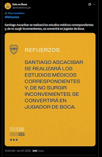 “Santiago Ascacibar se realizará los estudios médicos correspondientes y, de no surgir inconvenientes, se convertirá en jugador de Boca”, informó el club por intermedio de la cuenta Esto es Boca que utilizan para dar noticias oficiales de las negociaciones en cada mercado. Dentro de la negociación, de la que por ahora no fueron informadas cifras oficiales, se incluyó el préstamo por un año de Brian Aguirre al Pincha.