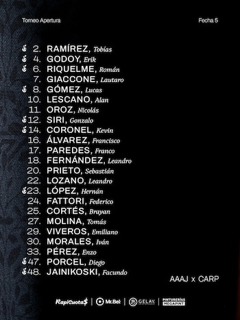Argentinos Juniors: Brayan Cortés; Leandro Lozano, Erik Godoy, Francisco Álvarez, Sebastián Prieto; Federico Fattori, Enzo Pérez, Alan Lescano; Hernán López Muñoz; Diego Porcel y Tomás Molina. DT: Nicolás Diez