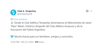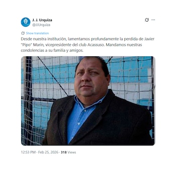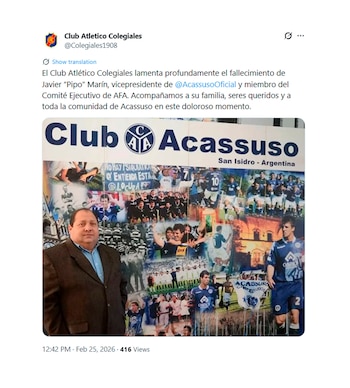 “La Asociación del Fútbol Argentino expresa su más profundo dolor por el fallecimiento de Javier Francisco Pipo Marín, vicepresidente del Club Atlético Acassuso y Vocal del Comité Ejecutivo de esta Asociación. Su partida enluta a toda la dirigencia del fútbol argentino, que hoy despide a un hombre comprometido, leal y profundamente identificado con los valores de la institución”, fue el mensaje de la AFA. En tanto, desde la Conmebol también expresaron sus condolencias: “La CONMEBOL lamenta profundamente el fallecimiento de Javier Francisco Pipo Marín, Vicepresidente del Club Acassuso y Vocal del Comité Ejecutivo de la @AFA. Condolencias a familiares y amigos. QEPD”.