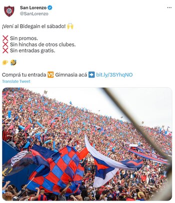 Este martes el que disparó primero fue San Lorenzo que para promocionar la venta de entradas para el partido ante Gimnasia por la séptima fecha de la Liga Profesional: “¡Vení al Bidegain el sábado! Sin promos. Sin hinchas de otros clubes. Sin entradas gratis”, fue el mensaje junto a dos emojis, uno de una mano haciendo el gesto de algo chico y otro riéndose. El primer punto fue en alusión a que su histórico rival ofreció la alternativa de canjear tickets con una promoción de una estación de servicio. Los otros dos ítems fueron por abrir el ingreso a los neutrales en la tribuna general que da a la avenida Caseros.