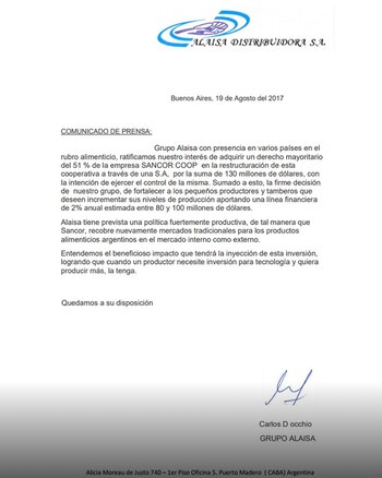 "Alaisa tiene prevista una política fuertemente productiva, de tal manera que SanCor, recobre nuevamente mercados tradicionales para los productos alimenticios argentinos en el mercado interno como externo", explicito la firma en la carta de intención dirigida al gerente general de la cooperativa láctea, Marcelo Gornati.
