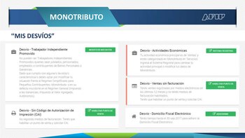 En esta opción, la página de internet para el monotributista presentará cinco posibilidades de desvíos e inconsistencias en sus declaraciones previas a la AFIP, tales como: 1) Trabajador independiente promovido; 2) Sin código de autorización de impresión (CAI); 3) Actividades Económicas; 4) Ventas sin facturación; y 5) Domicilio Fiscal Electrónico; con la posibilidad en todos los casos de modificar los datos y de habilitar los cambios que correspondan.