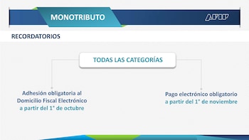 Adicionalmente, la AFIP ratificó que "a partir del 1 de octubre todos los monotributistas deberán tener declarado ante el organismo su Domicilio Fiscal Electrónico", porque será la principal vía de comunicación del organismo con el contribuyente, para evitar intermediarios. Y también que desde 1 de noviembre los inscriptos en todas las categorías deberán hacer el pago mensual del tributo por vía electrónica, esto es no podrá hacerlo en efectivo, sino a través de los sistemas habilitados por los bancos para operar en línea.