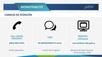 A partir de ahora todos los monotributistas tendrán tres canales de contacto con el organismo para hacer sus trámites, sin necesidad de movilizarse a una agencia de atención de la AFIP: la vía telefónica gratuita; el diálogo a través de mensajes con celulares inteligentes y la conexión a través de la página WEB del organismo especialmente diseñada a tal fin para este grupo de contribuyentes.