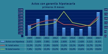 En los primeros ocho meses de 2017 los actos notariales consumados con garantía real ascendieron a 8.153 operaciones. Así se elevaron 154% en número y un 266% en valor. En el período significaron el 22,3% del total de compraventas, unos 8,6 puntos porcentuales más que en similar período del año anterior.