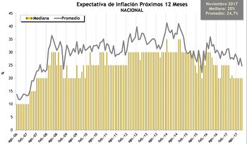 Según la Encuesta de Expectativas de Inflación correspondiente a noviembre de 2017, para el promedio de los encuestados las expectativas de inflación caen 3 puntos porcentuales respecto de la medición de octubre de 2017, y se ubican en 24,7 por ciento.