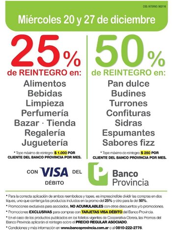 Los miércoles 20 y 27 de diciembre hay un 25% de reintegro con Visa débito de Banco Provincia en alimentos, bebidas, limpieza, perfumería, bazar, y en tienda de regalería y juguetería. El tope máximo del reintergo es de $1.000 por cliente del banco, por todo el mes.