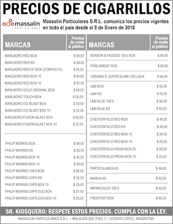 Entre las principales marcas que la empresa comercializa se encuentran Marlboro, que costará $58 en su versión KS y $59 en su versión box; Philip Morris, que costará $55 en su versión KS y $56 en su versión box; y la marca Chesterfield que costará $46 en su versión KS y $48 en su versión box.