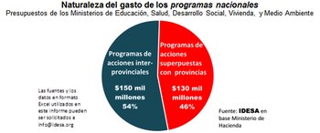 "Los programas nacionales superpuestos con responsabilidad provinciales y municipales no son un mero e inocuo desvío institucional. Implican, salvo contadas excepciones, una importante fuente de derroche de recursos. En lo discursivo se justifican bajo el argumento de que suplen vacíos de los gobiernos locales en áreas sociales importantes tales como arreglo y construcción de escuelas, centros de salud, calles o alcantarillados, distribución de materiales escolares y medicamentos, ayudas alimentarias y complementos salariales para docentes y personal de los sistemas de salud provinciales", refirió IDESA.