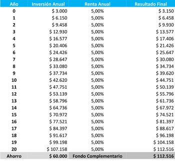 Esos USD 112.516 que tendrás en 20 años, significan una disponibilidad de USD 5.625,8 anuales por los siguientes 20 años o un equivalente a casi USD 470 adicionales a tu jubilación por mes. Pero como vos no utilizarás esos USD 112.516 todos de una vez, sino que retirarás algo mensualmente, el saldo lo podés dejar trabajando en inversiones, aumentando tu fondo complementario.