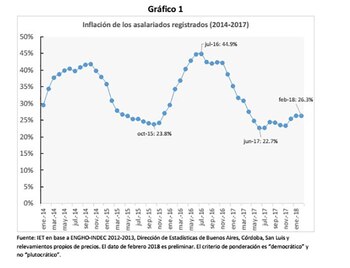 El informe también reporta que el salario real en el primer bimestre del año fue 1,7% inferior al de igual período de 2017. "Recordemos que en promedio 2017 el salario real había crecido 3%, tras haber caído 5% promedio en 2016″, dijo Trotta.