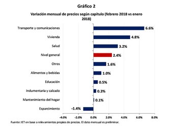 Según el IET la inflación interanual alcanzó un 26,3%, siendo la cifra más alta de los últimos 10 meses, y acumuló 4,4% en el primer bimestre; por lo que "para lograr la meta planteada por el Gobierno del 15%, los precios debieran subir a razón del 1% mensual" en el resto del año.
