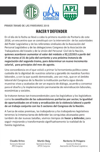 En un comunicado, Claudio Britos (secretario general de ATE Congreso), Martín Roig (secretario general de UPCN Congreso) y Norberto Di Próspero (secretario general de la Asociación del Personal Legislativo), aseguraron que "en el ámbito laboral del Congreso de la Nación la institución paritaria sigue dando muestras vivas y acabadas de ser un espacio de diálogo, acuerdo y consenso".