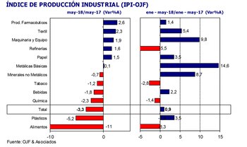 "Puntualmente, en el quinto mes del año la dinámica estuvo signada por lo acontecido en el segmento de Alimentos y Bebidas, el cual reportó una baja interanual del 8,8%. Este resultado fue consecuencia de una importante disminución en la producción de aceites y en la fabricación de gaseosas, que son dos de los segmentos que mayor ponderación tienen individualmente en el índice general", explicaron los economistas del estudio privado.