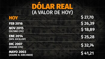 Sin embargo, los datos del llamado "dólar real a valores de hoy", ponen en duda esa idea. El cálculo que suelen realizar distintas consultoras, entre ellas Macroview –de Melconian y Santángelo–, consiste en traer a valores actuales el dólar de distintos momentos históricos (adicionándole la inflación y restándole la inflación de Estados Unidos en el período). Es una medida de lo que en la jerga se conoce como el "tipo de cambio real bilateral" con Estados Unidos.