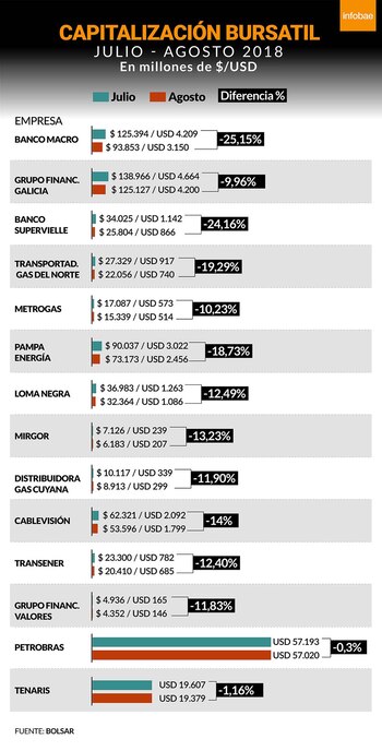 El 31 de junio el valor total era de $8.470.650 millones (unos USD 278.458 millones) pero el último viernes cerró a $8.243.546 millones (aproximadamente USD 270.990 millones). "La caída en la capitalización bursátil fue un combo entre el escenario externo, en donde la crisis de Turquía tiene algunos puntos en común con nuestra situación y la Argentina fue uno de los emergentes más golpeados, e interno. Fue un 70% externo y un 30% interno. El tema de los cuadernos no se sabe cuánto más profundo puede llegar a ser, lo que genera mucha incertidumbre en los mercados", explicó Sabrina Corujo, directora de Portfolio Personal.