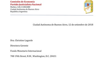 "Ciudad Autónoma de Buenos Aires, 12 de setiembre de 2108. Dra. Christine Lagarde. Directora Gerente. Fondo Monetario Internacional". Con ese encabezado, y membrete del Partido Justicialista Nacional con sede en la calle Matheu 128, el peronismo le envió una carta a la titular del FMI para pedirle que no le anticipe fondos al gobierno de Mauricio Macri.