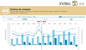 En cuanto a la encuesta de los shoppings o centros de compras, el INDEC informó que las ventas a precios constantes de abril de 2016, en julio de 2018, alcanzaron un total de $4.673,6 millones, lo que representa una disminución de 3,8% respecto al mismo mes del año anterior.