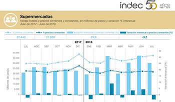 En cuanto a las ventas a precios corrientes para julio de 2018 relevadas en cadenas de supermercados por la encuesta sumaron un total de $37.443 millones, lo que representa un aumento de 25,9% respecto al mismo mes del año anterior.