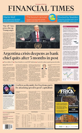 La renuncia de Luis Caputo al Banco Central, que ocurrió en medio del viaje de Mauricio Macri a Nueva York, donde se anunciará hoy el nuevo acuerdo con el Fondo Monetario Internacional (FMI), figura en un lugar destacado de la tapa de la edición del Financial Times de hoy.