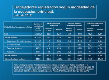 Significó una pérdida de 59.800 puestos en valores corrientes y de 56.900 ajustados por estacionalidad en comparación con el nivel de junio, que se explicó predominantemente por un "cambio de metodología entre el 2 de julio y el 10 de agosto de 2018 por parte del Ministerio de Agroindustria, junto con el Ministerio de Desarrollo Social, que decidieron reempadronar a los trabajadores de la categoría Monotributista Social Agropecuario (MSA). Implicó la interrupción temporaria en julio en el pago del MSA, lo que produce una disminución del número de trabajadores registrados de 47,9 mil trabajadores", informó la Secretaría de Empleo.