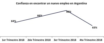 En el mismo sentido, apenas el 12% de los encuestados en Argentina indicó estar buscando un nuevo empleo de manera activa en el último trimestre del año, una marca sensiblemente inferior al 15% que afirmó estar buscando activamente un nuevo trabajo en los tres primeros meses del 2018.
