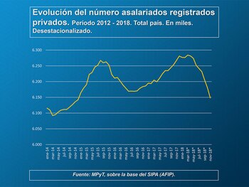De ahí que por séptimo mes consecutivo el conjunto del empleo registrado por el Sistema Integrado Previsional Argentino, sobre un total de 12,18 millones de personas ocupadas, se anotara un nueva contracción, a un ritmo de 1,4%, que significaron 172.200 ocupaciones menos en un año, según los datos aportados en la clásica conferencia de prensa mensual, en la que participó Infobae, en las oficinas del ex Ministerio de Trabajo, ahora Secretaría de Empleo bajo la órbita del Ministerio de Producción y Trabajo que encabeza Dante Sica.