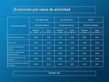 Por rama de actividad volvió a observarse en noviembre que tanto en el cotejo con el mes previo, como en comparación con 12 meses antes, las mayores pérdidas de puestos de trabajos formales tuvieron lugar en la industria manufacturera 1% y 5,2%, respectivamente; la construcción 1% y 4%; y el comercio 0,8% y 2,6 por ciento.