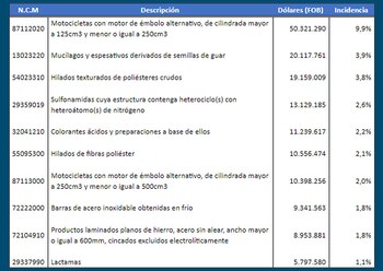 Por su parte, las importaciones argentinas desde India fueron de USD 510 millones en 2018, un 38,1% inferior al valor registrado el año anterior. Los principales productos importados fueron motocicletas con motor de émbolo alternativo, de cilindrada mayor a 125 centímetros cúblicos y menor o igual a 250 centímetros cúbicos, que representaron el 9,9% de las compras argentinas, mucílagos y espesativos derivados de semillas de guar (3,9%) e hilados texturados de poliésteres crudos (3,8%).