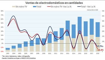 "De esta forma, en términos reales el consumo de estos bienes durables se desplomó 37% interanual en los últimos tres meses de 2018 y 7,7% en el total del año. Quitando el efecto mundialista que incentivó la venta de televisores en el primer semestre, la caída del sector hubiese sido mayor al 13% anual", explicó el estudio.