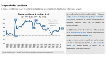 Según el último "Análisis económico de Brasil y su vínculo con la actividad productiva argentina", que publicó hoy la UIA, el tipo de cambio real subió 68% en 2018, "producto de las devaluaciones del peso, llevaron al tipo de cambio bilateral de nuevo a los niveles del 2011".